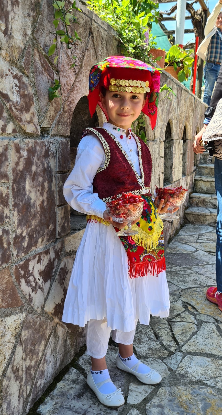 Kur e përgëzon Klaudian, gocën e vogël 6-vjeçare të shtëpisë, për mirësinë dhe urtësinë e saj, të përgjigjet “si shoqet”, një këmbanë e vogël për të mbajtur këmbët në tokë me thjeshtësi, ndonëse unë jam gjithnjë në krah të vetëbesimit të fëmijëve dhe kurajos që duhet t’u njihet dhe vlerësohet. Klaudia mbante dy vazo të vogla me karamele “Zana” në hyrje të bujtinës dhe kostumin tradicional të Mirditës, një përzierje ngjyrash dhe qëndismash që kthejnë në kohë dhe të japin njëfare paqeje të brendshme dhe të pushojnë sytë.